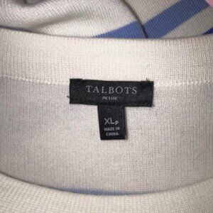 Talbots elbow sleeve blue and ivory stripe sweater top woman's size in a woman's size XLP, extra large petite. The bust is about 40 inches, length is about 24 inches. The material is 60% cotton and 40% rayon. The sweater to is in great condition with no holes or stains from my smoke free home.