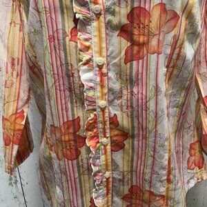 Talbots lightweight blouse. It is striped with flowers. Perfect for summer! It has a ruffle down one side of the front. Front darts.