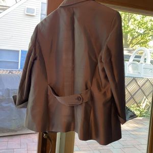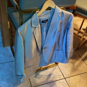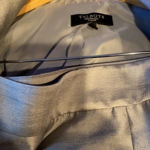 Talbots one button open front silver jacket. Can be worn anytime for a special occasions or to complete an outfit. Match it with a similar skirt also in my closet. Excellent condition with no damage. shell is 51% silk and 49% wool with 100% polyester lining. Pit to pit is 21. Shoulder to hem is 25”, shoulder to sleeve is 18, pit to hem is 15 and a half. Neck to hem is 27.