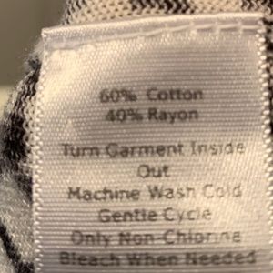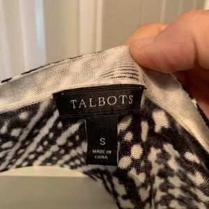 Gorgeous black and white cardigan by Talbots. Cotton and rayon. Love the pattern. Beautiful fabric. Fits true to size
