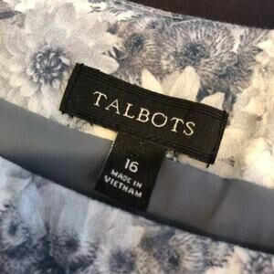Talbots gray white pink yellow floral midi sheath dress. Squared neckline. Short cap sleeves. Zips in back. Fully lined. Size 16. Excellent preowned condition. Minor wash wear.