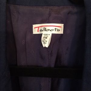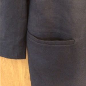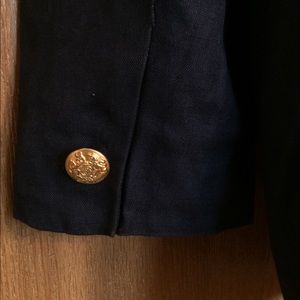 Beautiful blue blazer. Gold single button closure. Gold buttons on sleeves as well. Pockets on front as well as one small on on breast. Fully lined.
