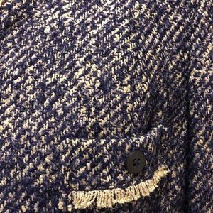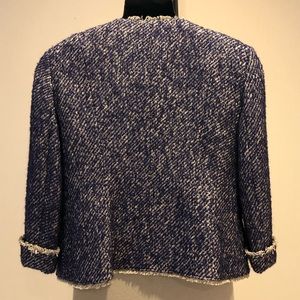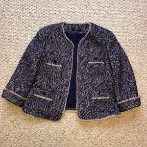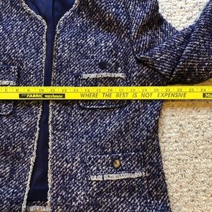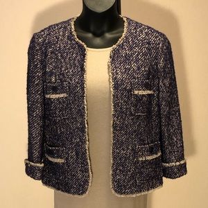 Talbots fully lined, four pocket, cuffed sleeved, fringed trim jacket. Seamed front and back for a sleeker fit.