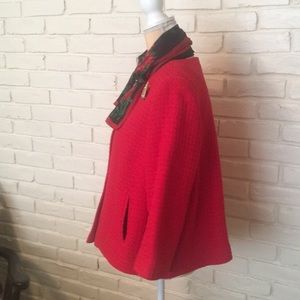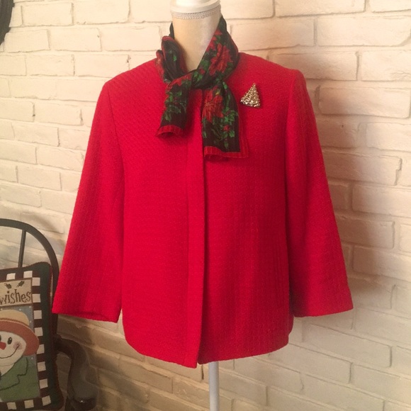 Talbots Red jacket with zipper front and 3/4 length sleeves. Measures 23 inches from shoulder to hem. 100% cotton. Holiday red and ready for any holiday event. Accessories not included.