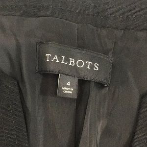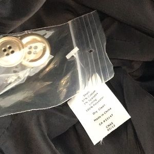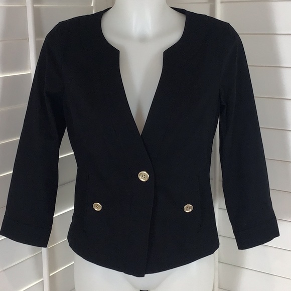 Understated black jacket with stitch-detailed band from hem to around neckline, single button closure, two hip pockets w/button, cuffed 3/4 sleeve. Extra buttons included, item is NWOT and in excellent condition. Measures approx 22” shoulder to hem, across bust front 17”. Size 4
