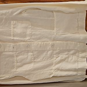 Talbots Irish linen jacket w Mandarin collar. Very stylish to wear open cuz buttons are same jacket material. Long sleeve w 3 buttons lined upward from wrist. Four flat pockets in front. Size 10