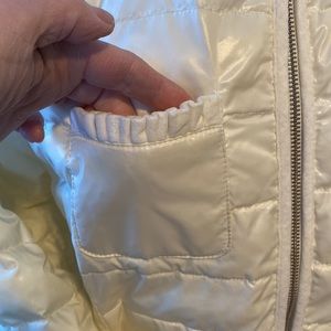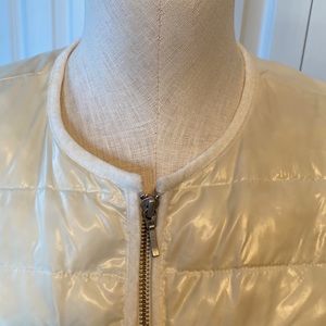 Cream in color this jacket has never been worn. No tags prima loft filling 100% polyester line and 100% polyester fill machine wash.