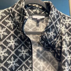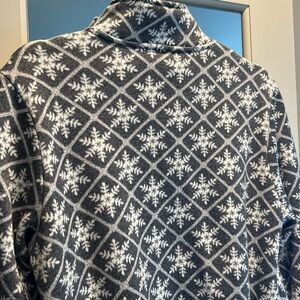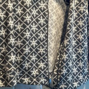 Great comfortable material. Lightweight, almost like a sweatshirt. Gray and white snowflake pattern. Very lightly worn and in great condition. Offers welcome!