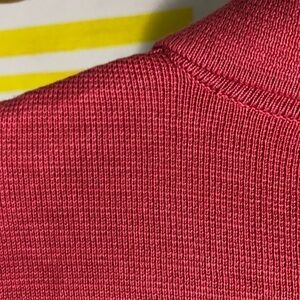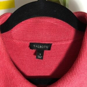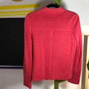Talbots single-breasted knit jacket in coral pink. Three buttons, front pockets. This garment is a hybrid of a jacket and a sweater. Feel free to ask questions! Two tiny pulls on sleeve and bottom hem as shown.