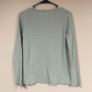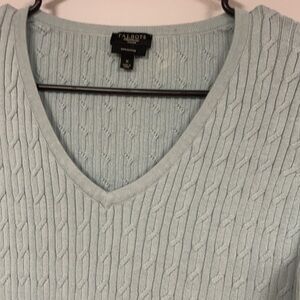 Women's Talbots light blue/green V neck Pullover Sweater Size says 'X'. Looks like a generous small. Cable front, 100% Pima Cotton, excellent condition