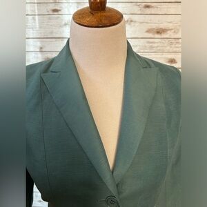 Seagreen; peak label; long sleeves w/ 4-button detail; two-button front closure; two front welt pockets; fully lined; curved hem