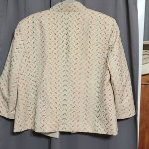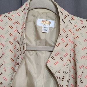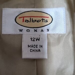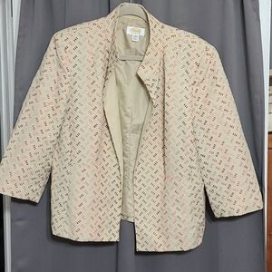 Talbots linen/cotton blend blazer. Light tan with coral, aqua, gray, rust, and brown embroidery. Lined. Light shoulder pads. Pre-owned, good condition. There is black spots on inside of front edge. Doesn't show unless you fold collar open. See pic. Size 12W(armpit to armpit approximately 20 inches. Length approximately 23 inches)