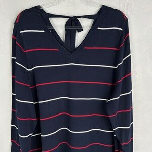 Talbots long sweater plus size 2X double v tie back navy stripe 100% Pima cotton