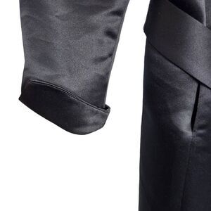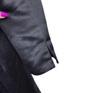 Beautiful black dress midi length wrap style jacket with hidden tie. Beaded and embroidered tie front belt. Long sleeve with notched wrist can be work folded or down.