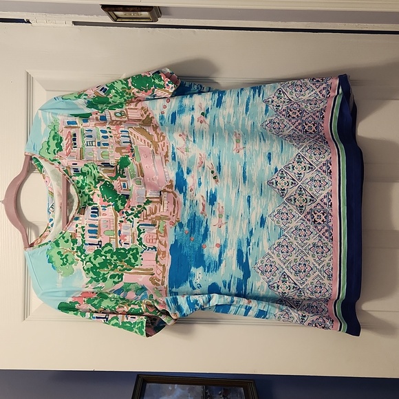 Talbot's knit top, short sleeves, beautiful multi colored sea shore/beach themed design on front and back, colorful abstract birder design, navy/white/light blue/green/pink/black colors, cotton/spandex, size 3X, no tags but brand new, never worn