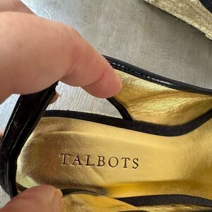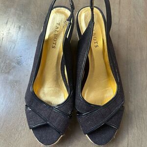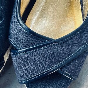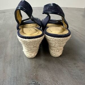 Step out in style in these navy blue slip on espadrille sandals by Talbots with front canvas criss-cross straps in patten leather trim. 2 1/2” wedge heels.