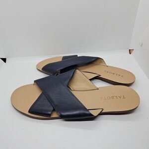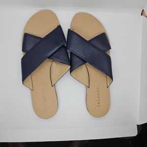 Leather sandals with criss-cross straps in navy blue. Left shoe has some separation on the edge of the strap, but in otherwise good condition.