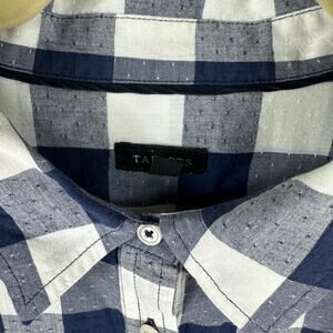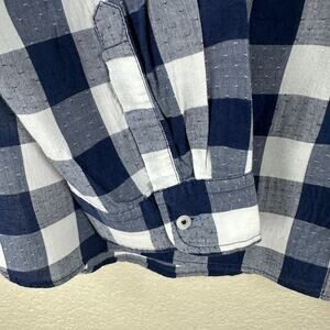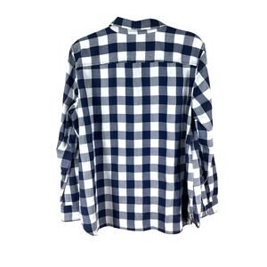 This Talbots women’s button-front shirt features a classic navy and white gingham check pattern with a subtle textured weave and embroidered dragonfly logo near the hem. Designed with a collared neckline, button cuffs, and dual front pockets, it offers timeless preppy style that pairs beautifully with jeans, chinos, or shorts. Made from a soft blend of 55% cotton and 45% modal for breathable, lightweight comfort. Made in India. Machine wash cold. Please review pictures for details.