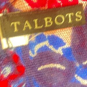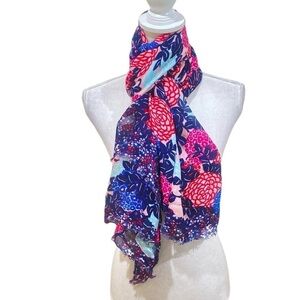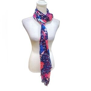 Talbots floral print rectangular scarf in navy/blush/red & aqua. Fringe hem. No fabric tag. Feels like linen & cotton blend. Euc