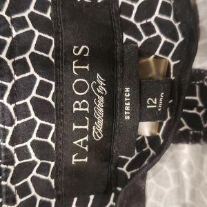 Black and white, geometric design, size 12 Talbots pants. Button, hook, and zipper closure. Single pocket in the back. Perfect for work or church!