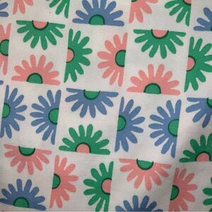 White with boxed daisy pattern design! So cute! Front pockets, nice material . 10” inseam