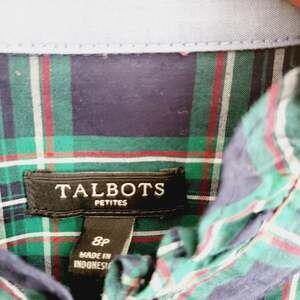 Talbots green and navy plaid ruffled button down shirt. Size 8P. Has buttons on sleeve to roll. Excellent used condition.