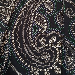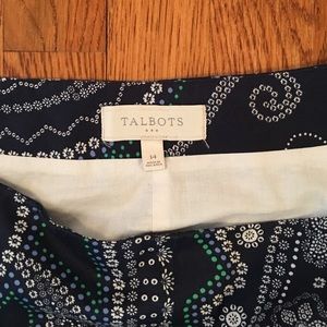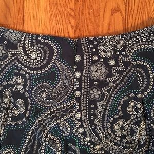 This pleated a line skirt has a beautiful paisley print on a navy blue background. This flattering skirt looks impressive on, perfect for the office. But feels light and is a joy to wear. Fully lined hidden side zipper. 98% cotton, 2% spandex machine washable