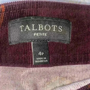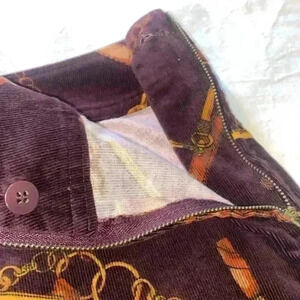 Talbots riding themed burgundy printed corduroy skirt. Size 4P. In pristine pre loved condition Waist measures 30” & skirt is 18” long. Side zip/ button closure.
