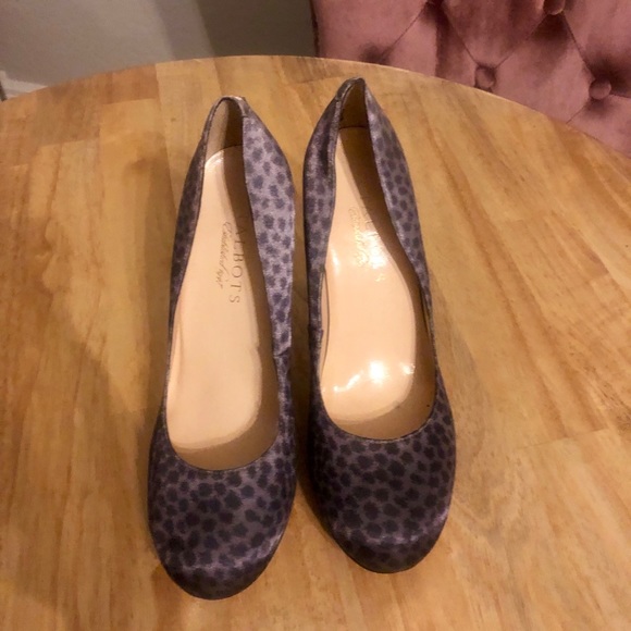 Worn once. Talbots printed heels. Hidden platform in front and 4” heel. Gray and black.