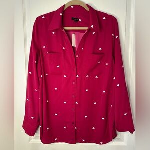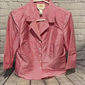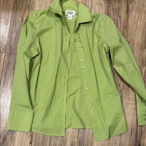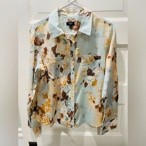 Talbots aqua button down long sleeve blouse with white stitched pattern. Gently loved and well cared for. Minor snag in right pit (see last photo). Barely able to notice while worn. Sleeves roll up and button flap secures.