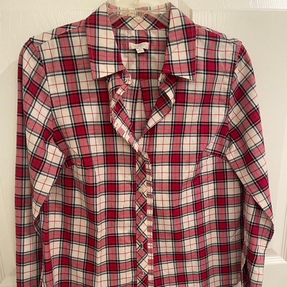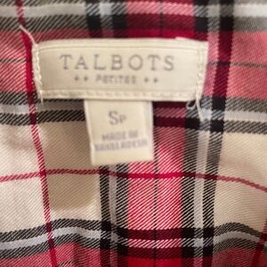 New and in Excellent condition. Beautiful plaid top, 98% cotton 1% metallic (gold thread throughout) Red/black/white/gold small/ petite Seams on side give it a feminine shape soft cotton fabric perfect for holidays ! size small petite