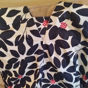 Dark blue, white and red floral. Zip up in back.