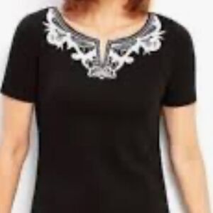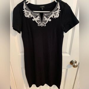 Black dress with white embroidery along neckline
