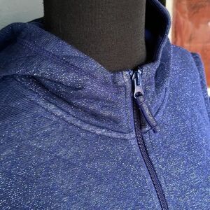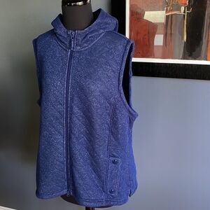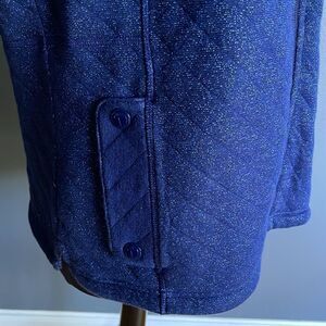 Talbots sparkle navy quilted knit zipper front hoodie vest. Princess seaming front and back. Lower front vertical flap pockets with logo button accents. NWT. pXL. Cotton/polyester/metallic blend. Back 100% cotton. Fill 100% polyester. Lining cotton/polyester blend. Nonsmoking home.