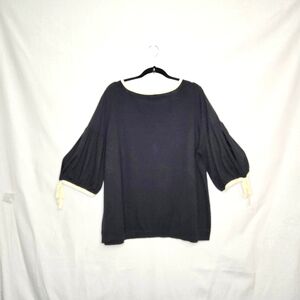Talbots Summer weight sweater. Short sleeves are full and feature a vertical slit, with a tie at the bottom. Solid black with off-white or cream colored trim.