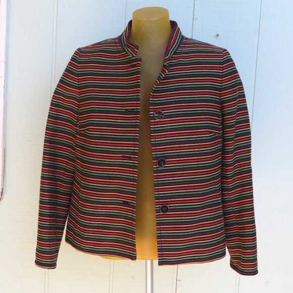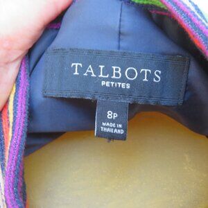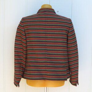 Classic Talbots jacket with small stripes. Colors are red, yellow, green, purple and dark navy/black. Two faux pockets in front, fully lined. Very good used condition.