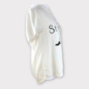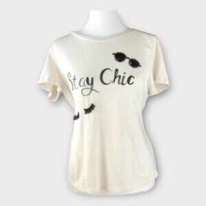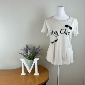 Y’all this t-shirt is so stinking cute. It is beige and the material is textured/heathered. It has Stay Chic with these embellished sunglasses and fabric eyelashes. Just precious. It has a very small snag about 1 1/2” from hem on front but it super small and not noticeable. Rounded hem with split sides.