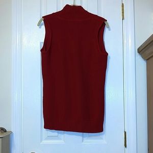 A cardinal red, sleeveless, medium knit sweater. It has a low, ribbed cowl neck and ribbed banded hem. The sweater would look really cute with a shirt or camisole underneath it. Although, it's labeled Petite, it is oversized and can easily fit a regular figure. Tiny pull as shown in third picture. 100% cotton. Machine wash cold. Lay flat to dry. No trades. No PP.