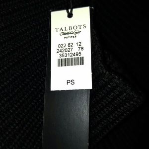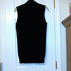 A black, sleeveless, medium knit sweater. It has a low, ribbed cowl neck and ribbed banded hem. The sweater would look really cute with a shirt or camisole underneath it. Although, it's labeled Petite, it is oversized and can easily fit a regular figure. 100% cotton. Machine wash cold. Lay flat to dry. No trades. No PP.