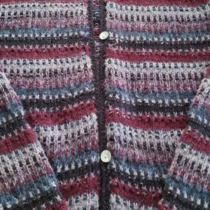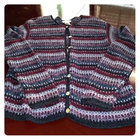 Cardigan with blue and purple stripes. Beautiful, warm. One button missing but bottom button could be moved up easily. Straight sweater. Gently used condition.