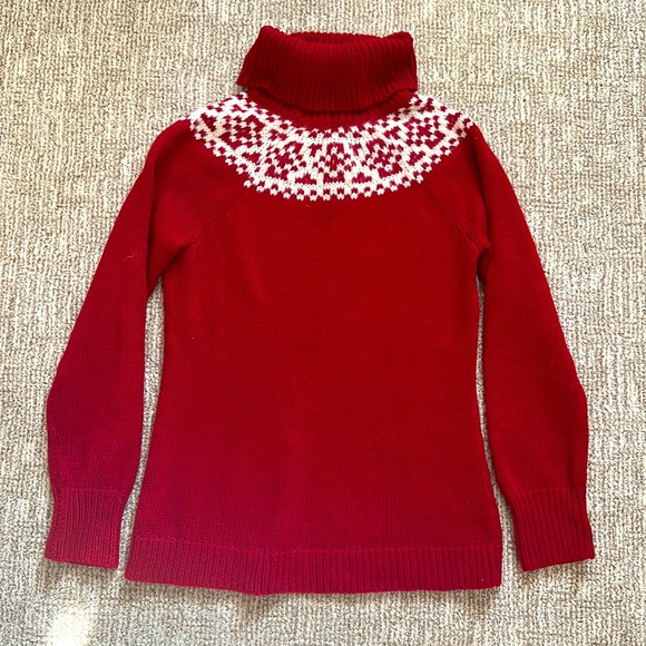 Beautiful red sweater with loose turtleneck design. One tiny little thread pull, (see pic) in the back, otherwise perfect.