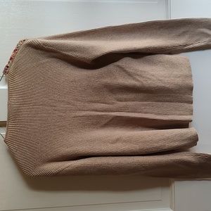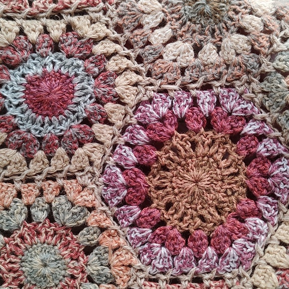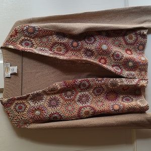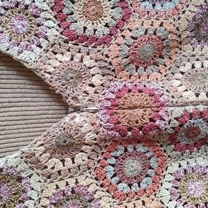Vintage look crochet front cardigan zips up the front with a neck opening. The back and sleeves are oatmeal color while the front has gorgeous muted purple, orange,blue, burgundy,rust and browns. It is machine washable. I think it would look great with a solid tee and jeans