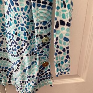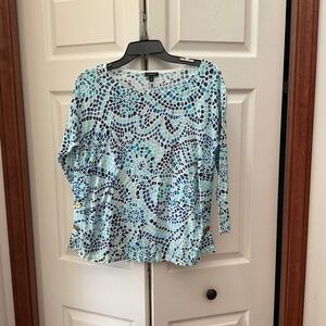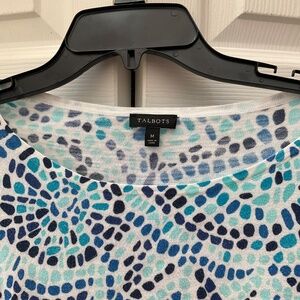 Talbots lightweight sweater, size medium in blue and teal design, cute gold button design on side, great for Fall as this is really lightweight, length 24” and pit to pit 19”