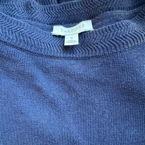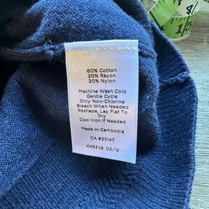This is a cotton/nylon sweater by Talbots. Navy blue in excellent condition it measures 20 inches across from side to side and 23 inches long from the top of the neck to the hem.