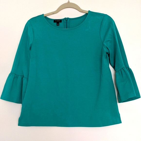 more green than in the photos - a bright fun color talbots 3/4 Bell ruffle sleeve top 1/4 zip back like new