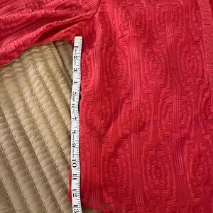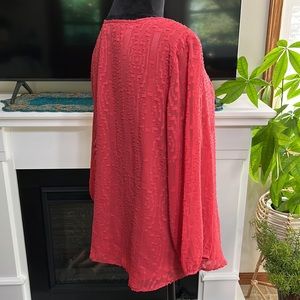 Talbots coral textured, long sleeve (falls above my wrist) sheer overlay with dyed to match lining. Small gold buttons on the bottom of the sleeves. Placard partially down the middle with 3 hidden buttons.