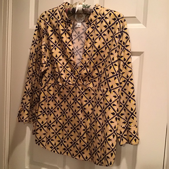 Perfect summer topper yellow background with navy blue geo design. Stretch with 98% cotton and 2% Lycra. Machine wash and dry.