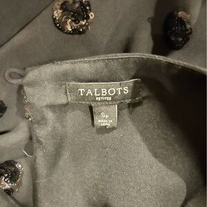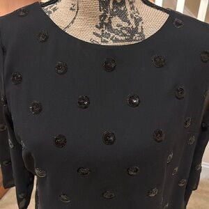 Beautiful black short sleeved top Has decorative buttons Polyester material is machine washable In great shape