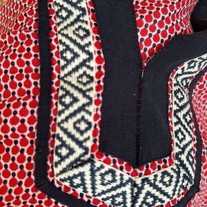 This is a very fun top with red with and blue with ribbon detail around the neckline and side slits at hip area.