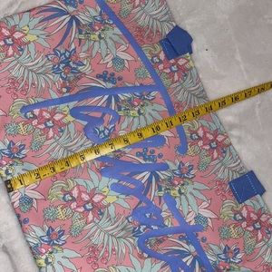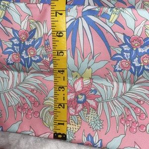 Talbots pink floral canvas tote. Light blue canvas handles. Same light blue “Talbots” (word) across one side of totes. No pockets. See pictures for measurements. New.